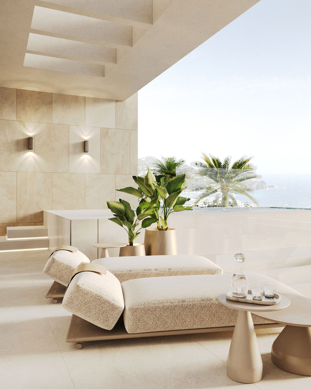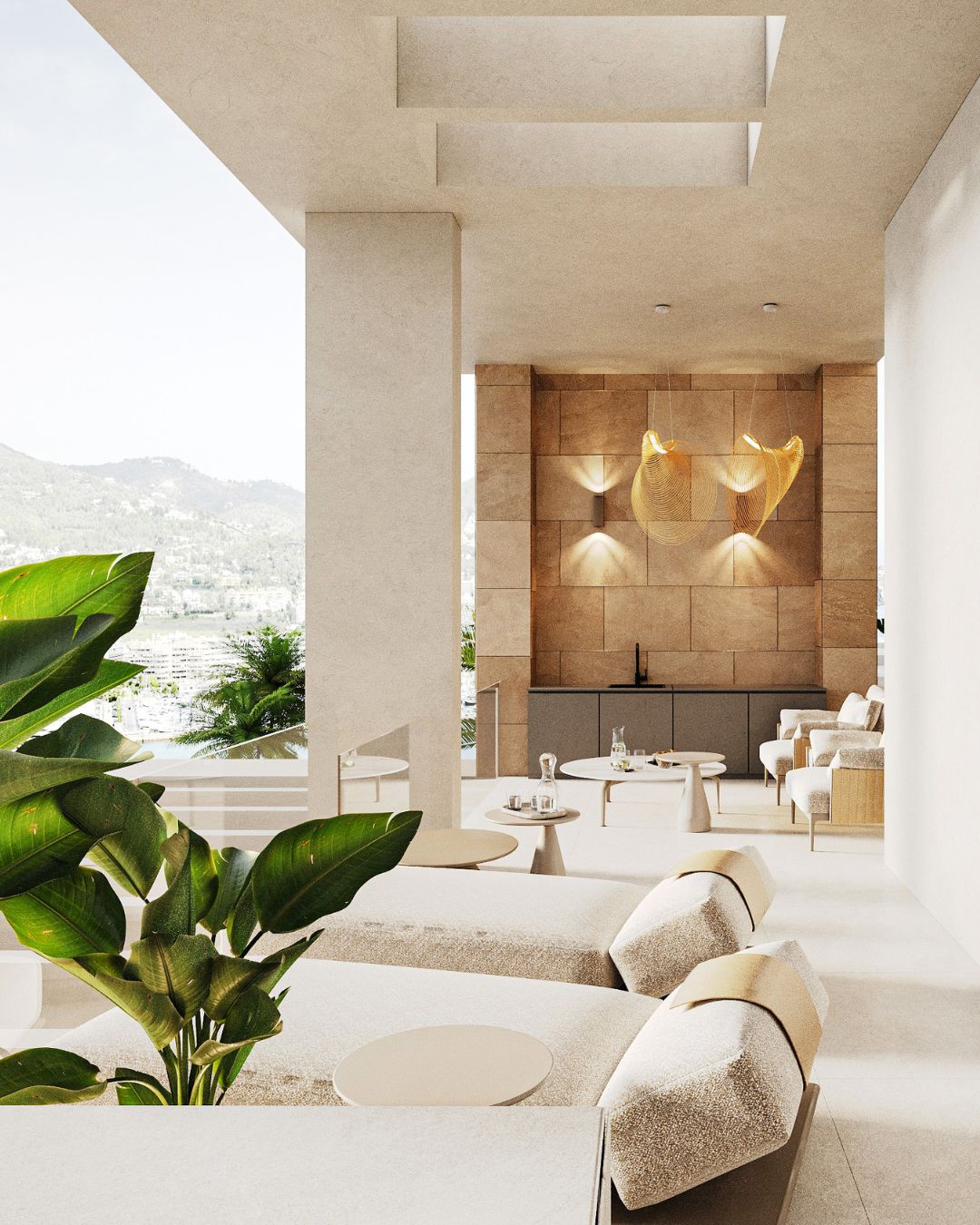 Piedras claras, vetas sutiles, mobiliario a medida y líneas suaves convierten el ático en un santuario que no compite con la naturaleza, sino que la enmarca y deja que la luz mediterránea fluya hacia el interior.