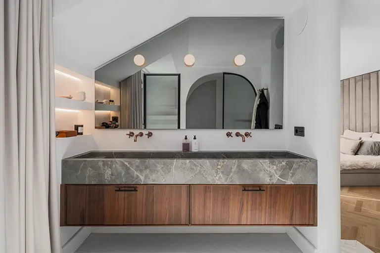 Entre los acabados de alta gama se incluyen 15 altavoces Sonos integrados (tanto en el interior como en las terrazas), interruptores y enchufes inteligentes de Buster and Punch, y detalles que reflejan una atención absoluta al diseño. En los baños y el aseo de cortesía se ha utilizado microcemento, aportando un ambiente moderno y limpio. Todos los espejos son de cristal tintado a medida, y las duchas cuentan con mamparas de diseño exclusivo, incluida la ducha doble de la suite principal.